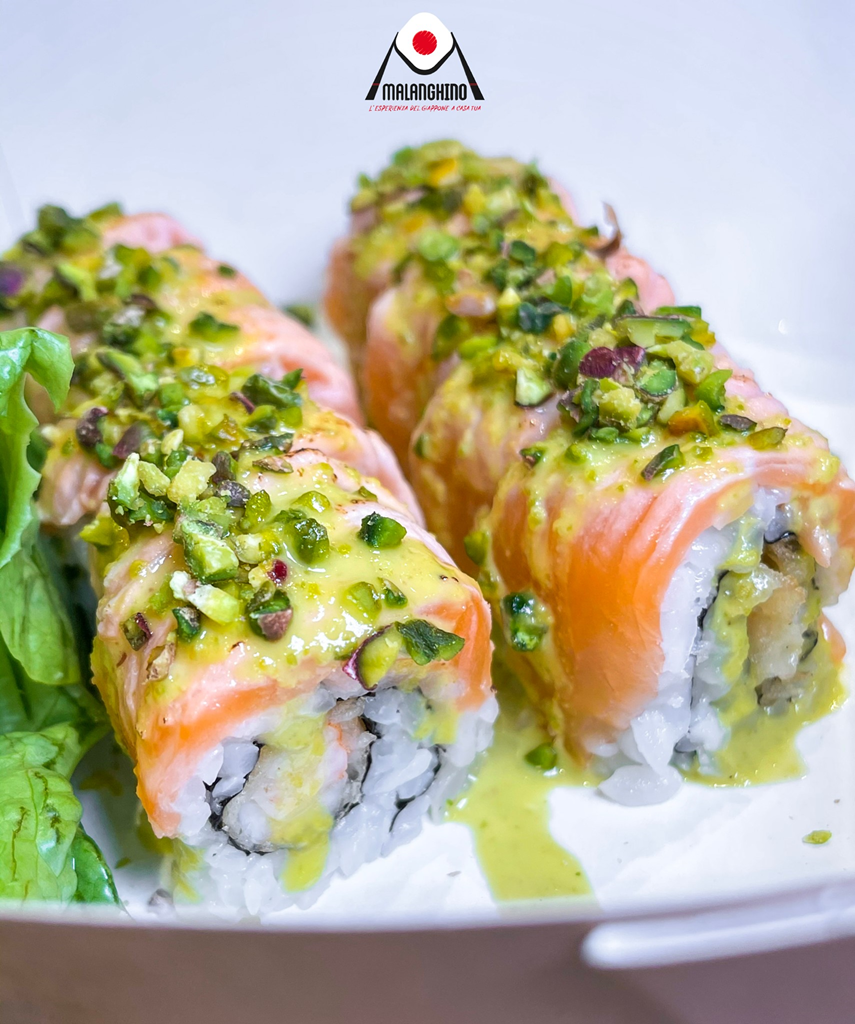 Riso, gambero pistacchiato, salmone scottato, salsa al pistacchio, salsa teriyaki e granella di pistacchio